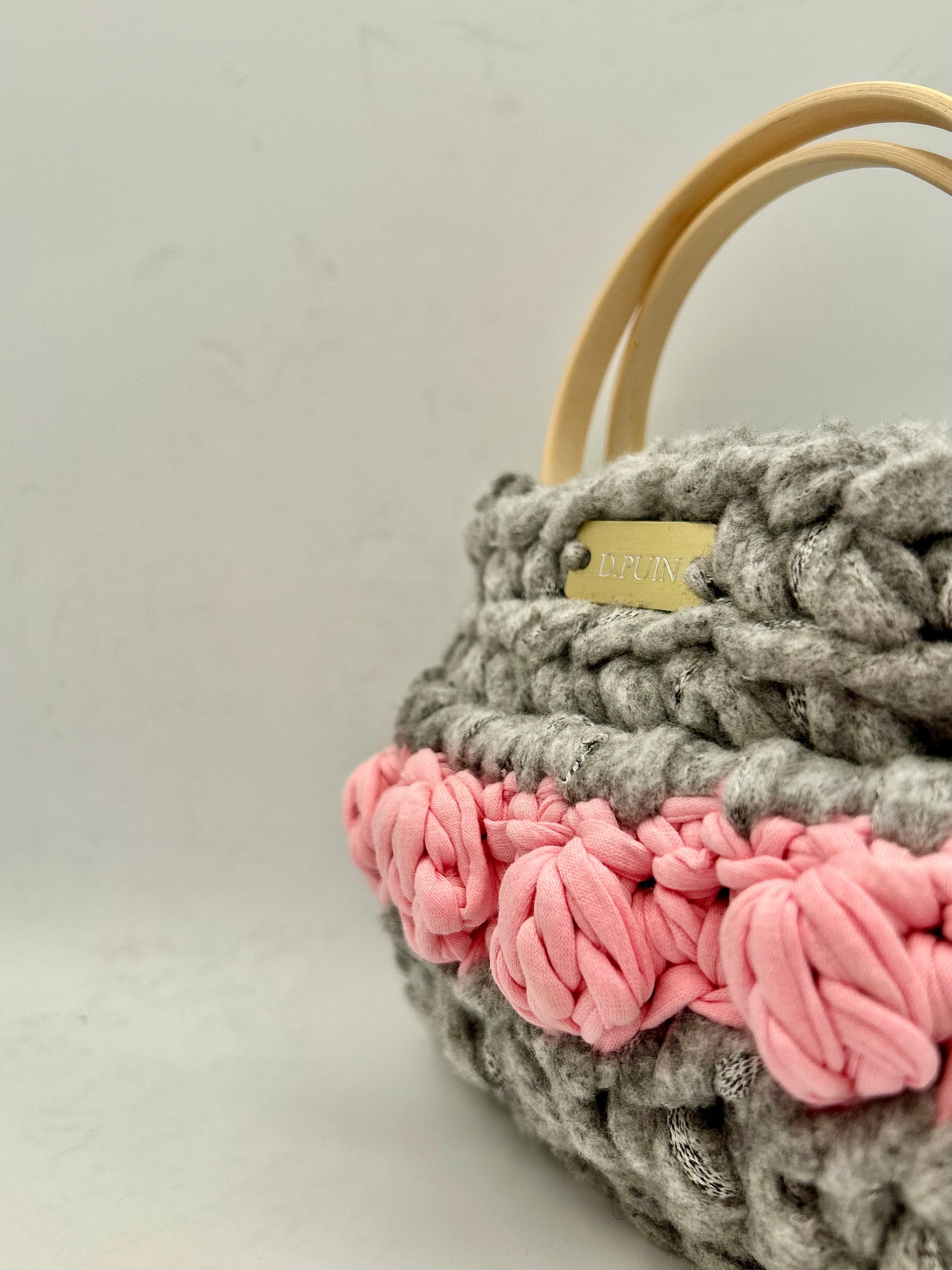 Playful as sea foam and as sweet as bubblegum, this handmade crochet bag is a soft pink and grey dream. Made sustainably with recycled fabric—because fun and fashion should be guilt-free. 🌊🎀