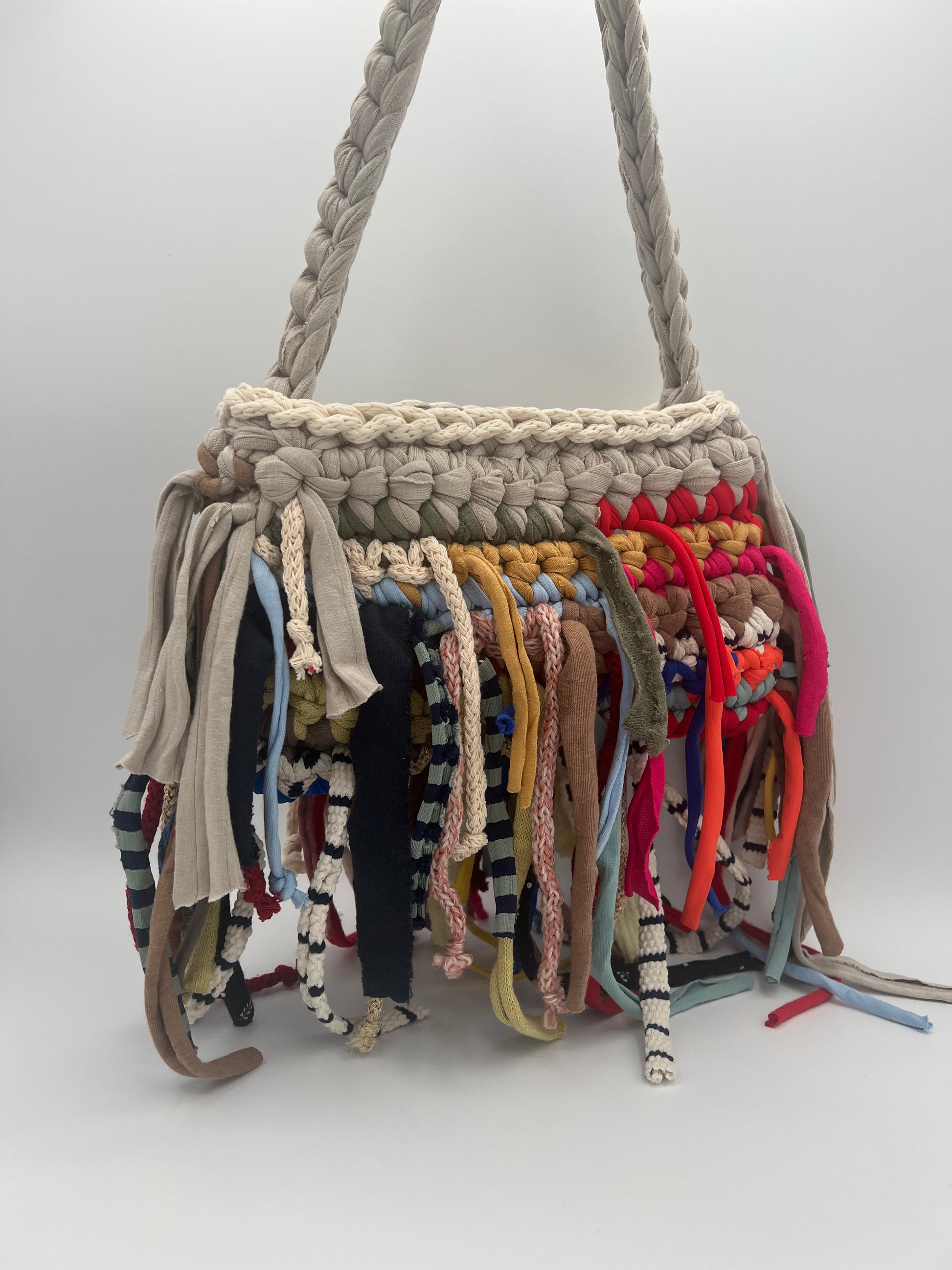 Crafted from a mix of recycled cotton yarns in vibrant, clashing tones, this bag is a joyful burst of movement and texture. The extra-long fringe creates a fluid silhouette that sways with every step — a playful nod to island festivals and Ibiza street style. Each piece is one of a kind, with colors chosen intuitively for maximum expression.