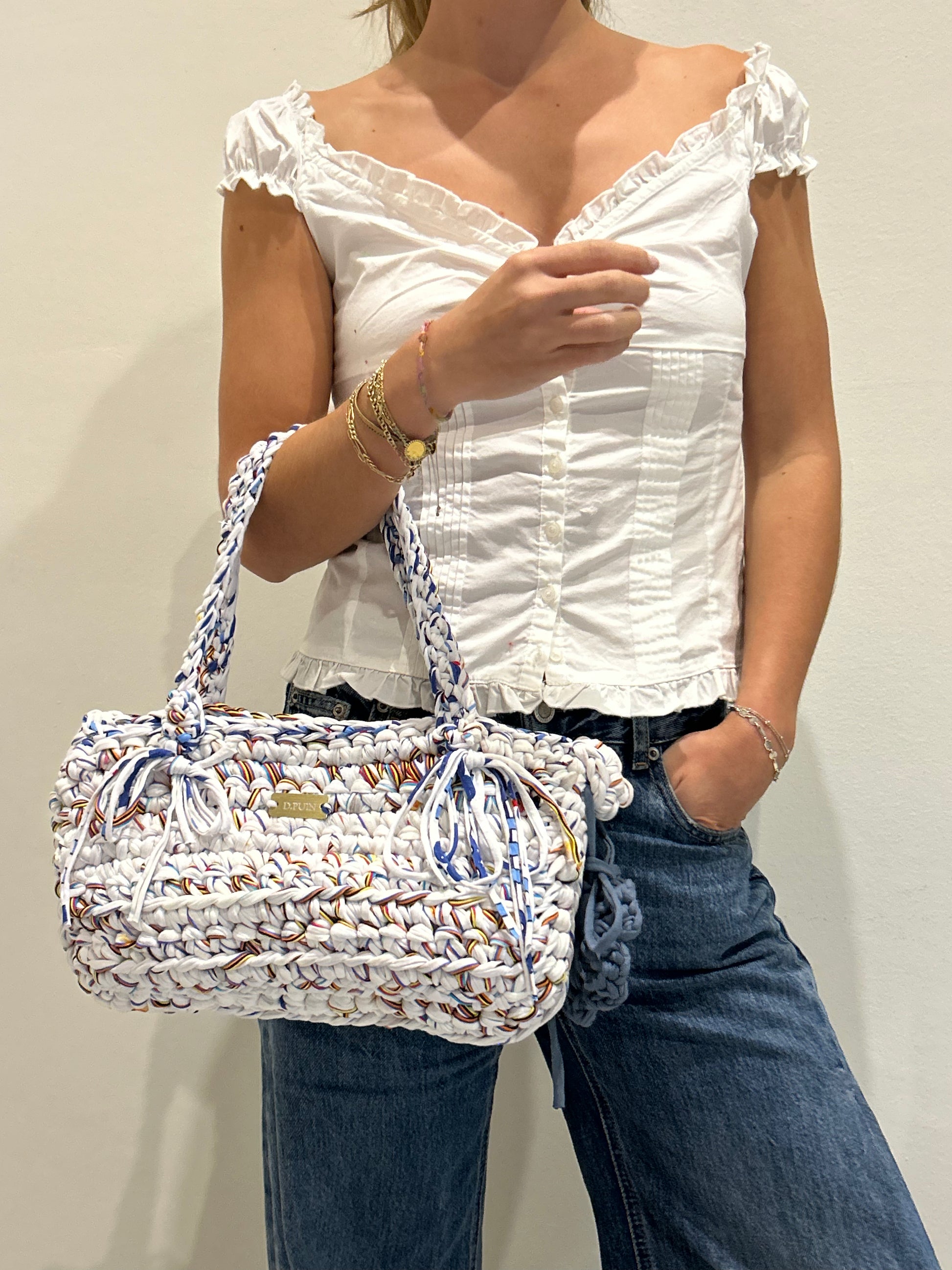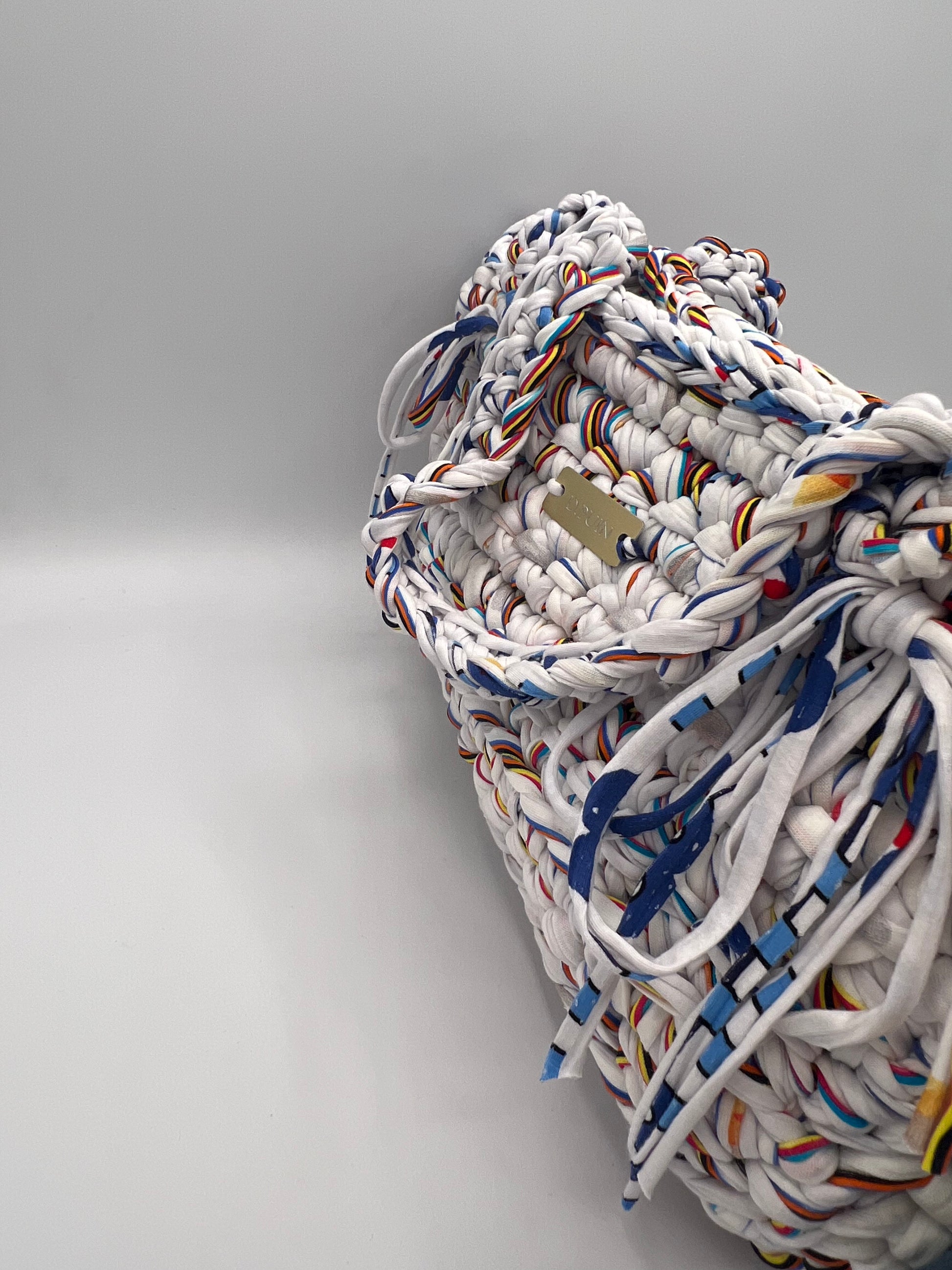 A roomy white crochet bag with colorful specks and a blue flower charm. Joyful and handmade with upcycled yarn, perfect for bright days and bold spirits!!