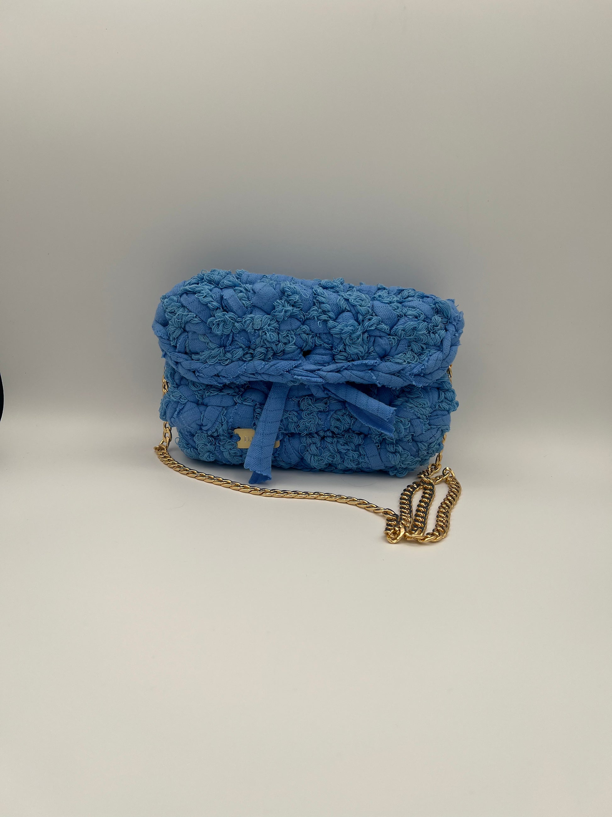 A textured blend of blue yarns in two distinct materials, finished with a soft fold-over flap for a classic shape. Inspired by shifting tides and layered seas, this handcrafted piece is functional, elegant, and easy to pair. Made from leftover yarns with care — limited, like every wave.