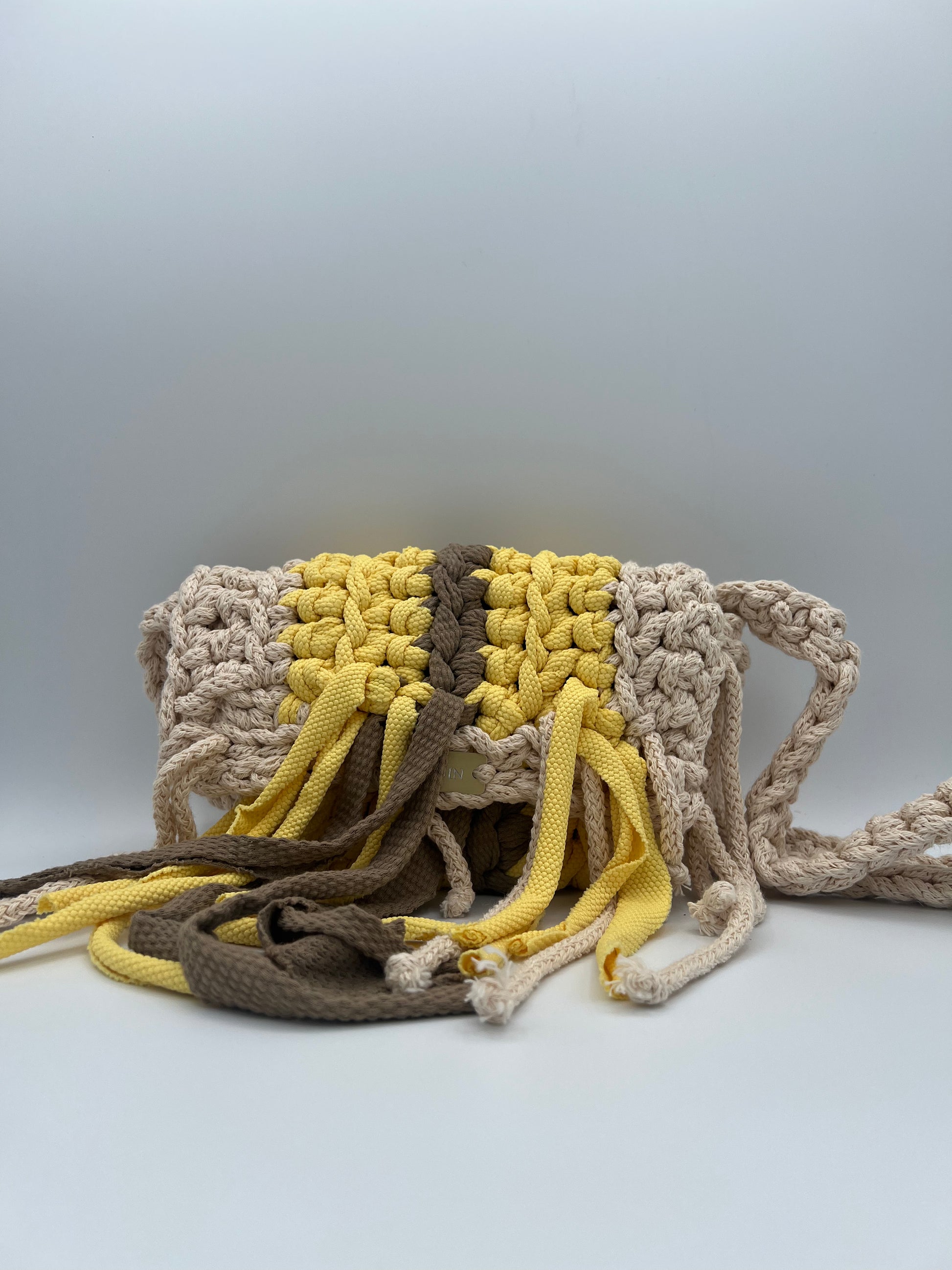 Beige, brown, and yellow tones combined in a soft striped mix, finished with a flap and playful fringe detail. Handmade from leftover yarns, this piece is textured, warm, and easy to style.