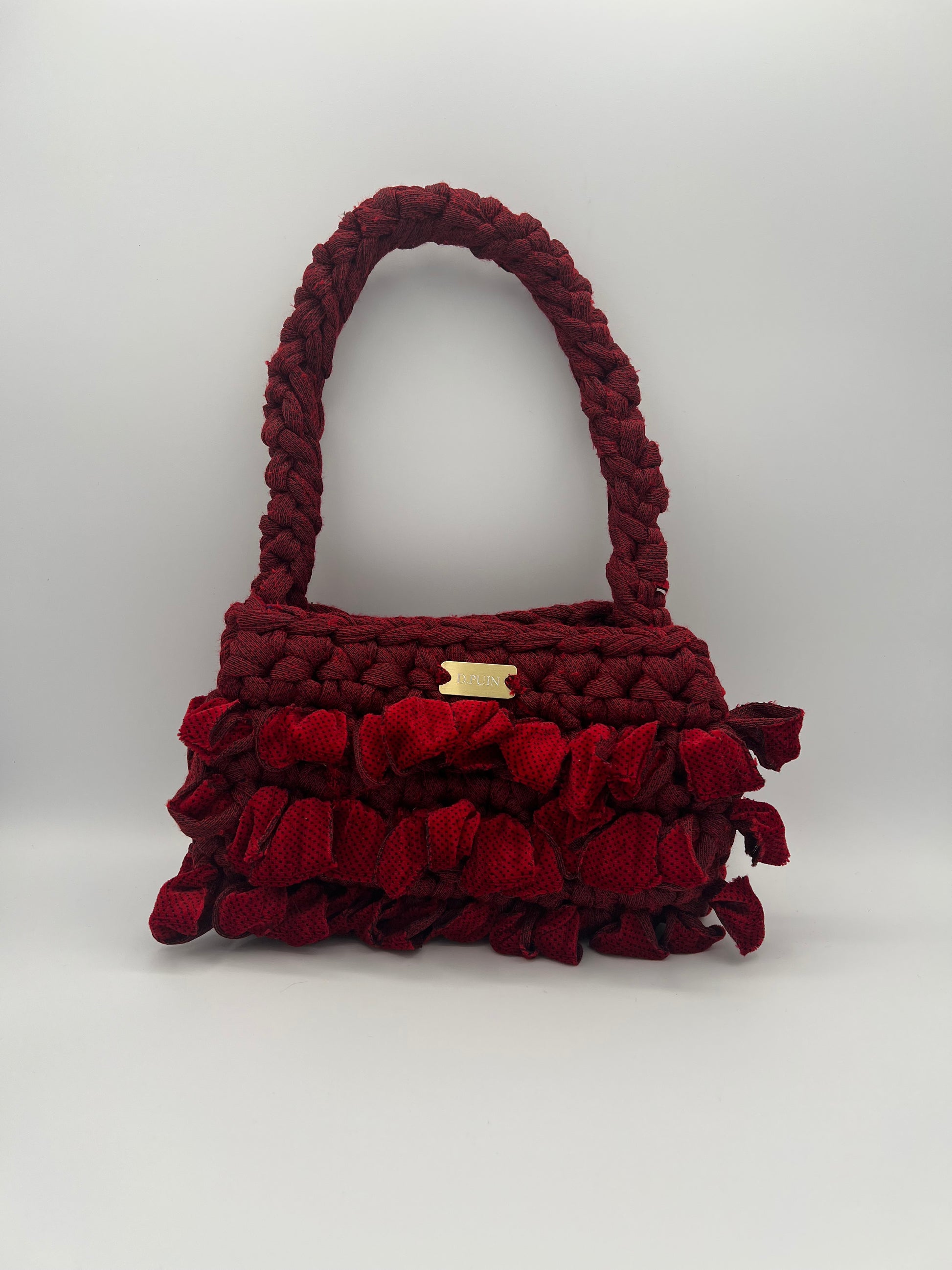Deep velvet red with delicate polka dot fringe details — this bag feels festive, bold, and a little bit cheeky. The soft texture and subtle pattern make it perfect for special occasions or nights out. Handcrafted in limited batches using rescued yarns for a rich, one-of-a-kind finish.