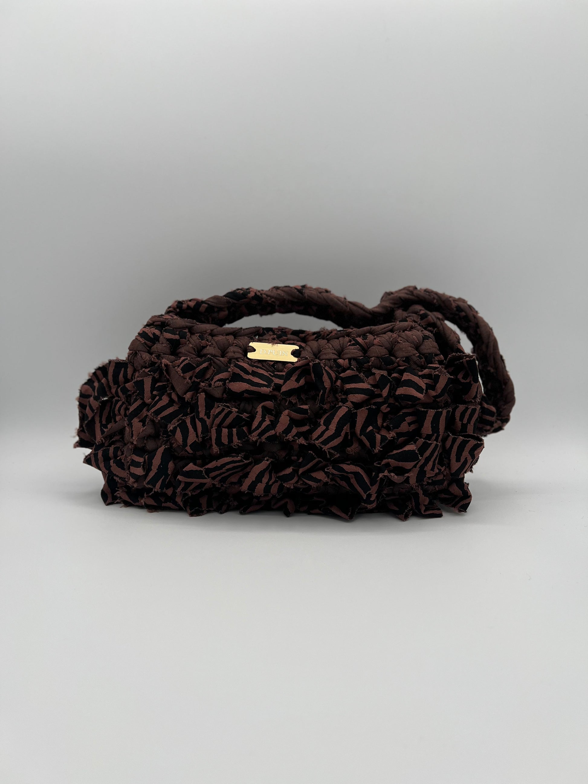 ne-shoulder bag featuring a zebra-inspired black and brown pattern. Finished with soft ruffle detailing and crafted from upcycled yarns, it strikes the balance between playful and grounded. A statement piece for wild hearts with a love for texture and slow fashion.